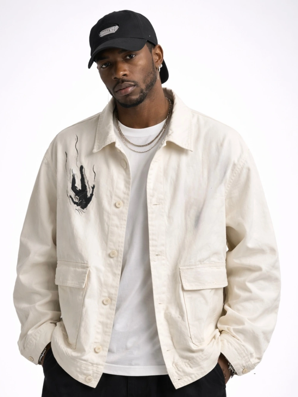 Handcrafted as a one-of-a-kind wearable artwork, this KRTA jacket features original hand-painted illustration inspired by inner conflict, control, and spiritual chaos. Designed with a raw yet refined aesthetic, the fabric carries a lived-in texture that enhances the depth of the artwork. No two pieces are ever repeated — this jacket exists as a singular expression.